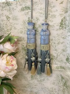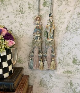 Dancing Bear tassels are handcrafted in our home in Windsor, Connecticut. Each tassel is made by hand. We use antique and vintage trims and ribbons to embellish these whimsical accessories. Have a Herend china collection? Hang a Herend tassel on the cabinet door. Love Quimper ware? Use a beautiful tassel made from a Quimper salt shaker to dress up your china cabinet. Hang a whimsical mouse from your entertainment center, or choose a Nippon piece to decorate your bedposts. Use your imagination to choose the perfect tassel for the perfect location in your home. Dancing Bear tassels are beautifully handcrafted with plenty of tasteful whimsey.