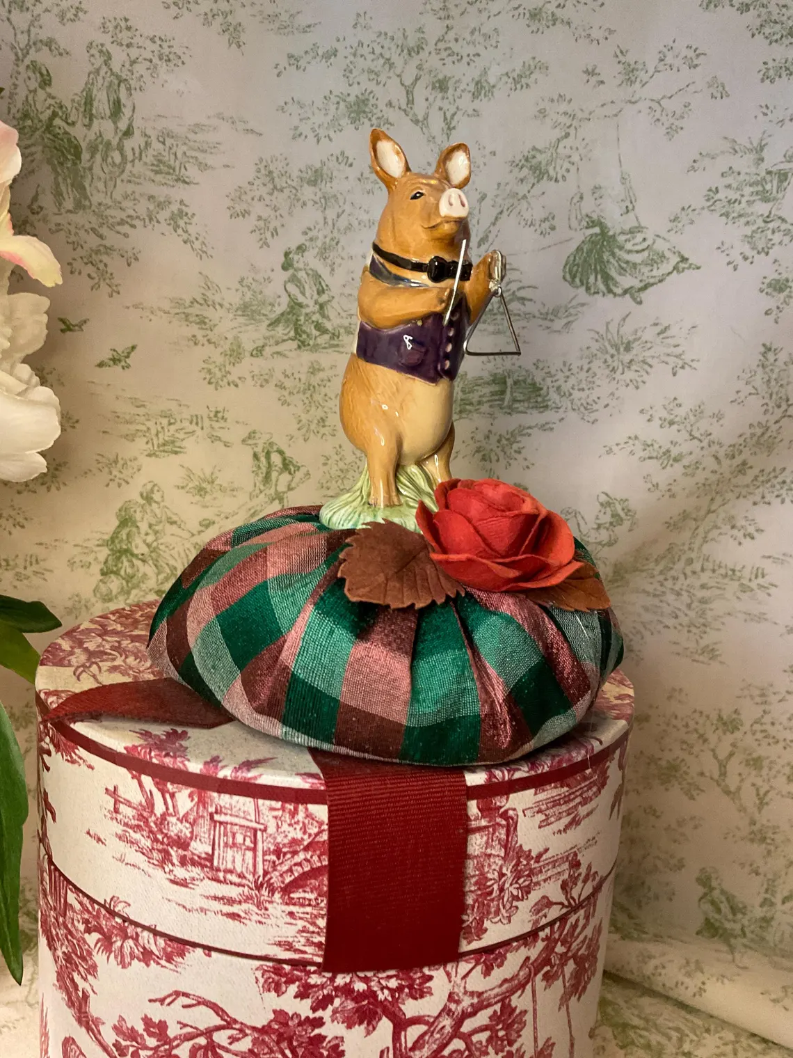 This adorable Beswick pig figurine is ready to play his triangle! He sits atop a lavender sachet. The sachet is hand sewn from dupioni silk and contains French lavender and buckwheat hulls. It has been decorated with brown leaves and a rust colored rose. This unique ached is 6” tall and the sachet is about 4 1/2” wide.