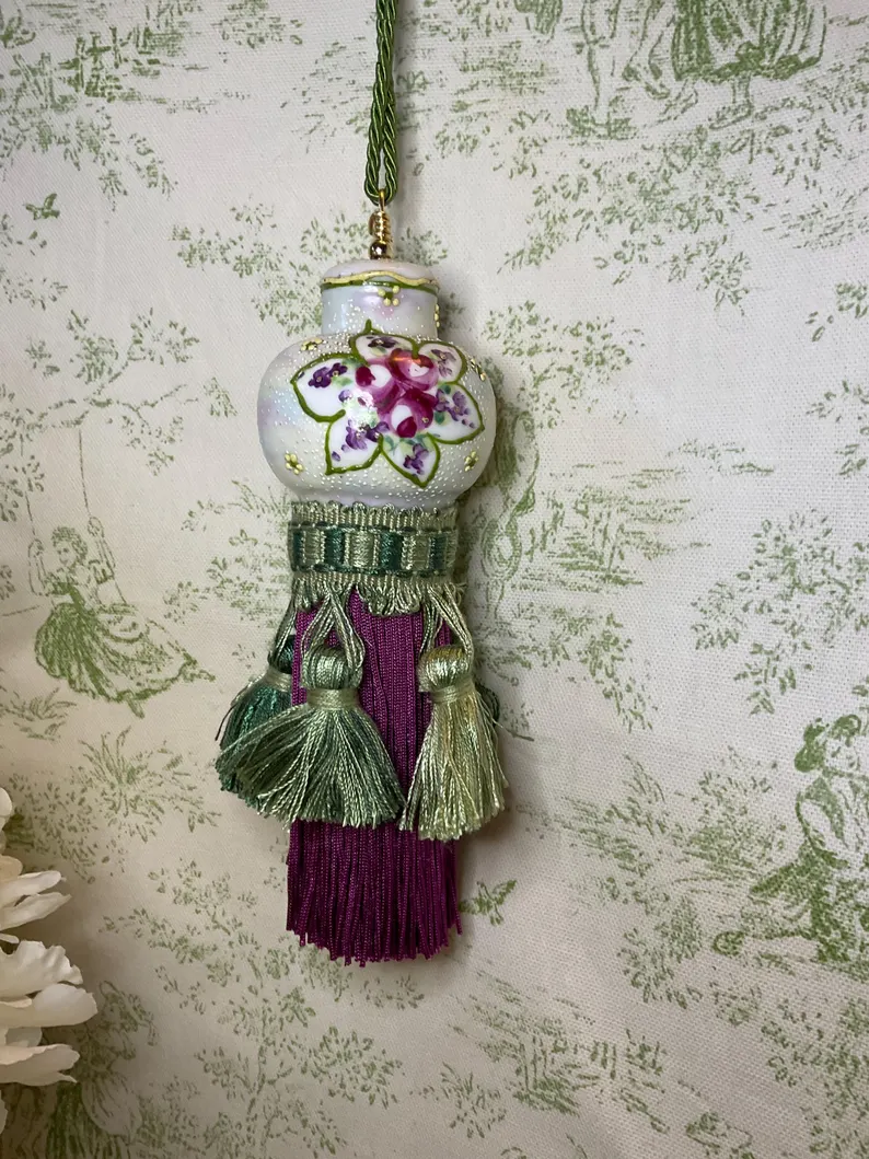 This vintage shaker wi adorned with moriage work around the hand-painted flowers. It has been crafted into a unique decorative tassel to enhance your home decor. The handcrafted tassel is a rich berry color that complements the hand painting. the tassel trim is in various shades of green.